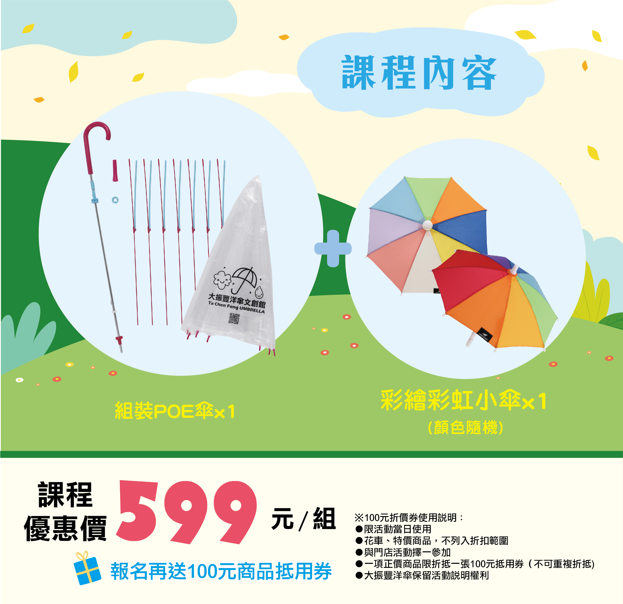 (5).報名一組再贈100元商品抵用券。(可用於1F傘具販賣區)