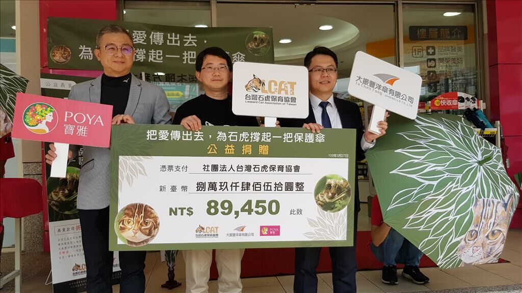大振豐洋傘與寶雅國際3月27日上午在台中寶雅學士店,共同舉辦 「把愛傳出去,為石虎撐起一把保護傘」公益捐贈儀式,由大振豐洋傘陳奕錩協理與寶雅商品採購部蔡明倫協理,共同捐出新台幣89,450元(取諧音:幫助石虎) 給 「台灣石虎保育協會」,並邀請台灣石虎保育協會余建勳顧問出席,共同見證,盼能喚起更多人對保護石虎的意識,鼓勵民眾以實際行動,共同為台灣石虎生態撐起保護傘。