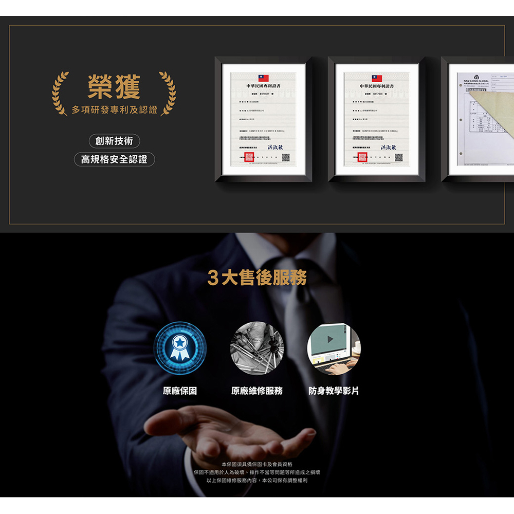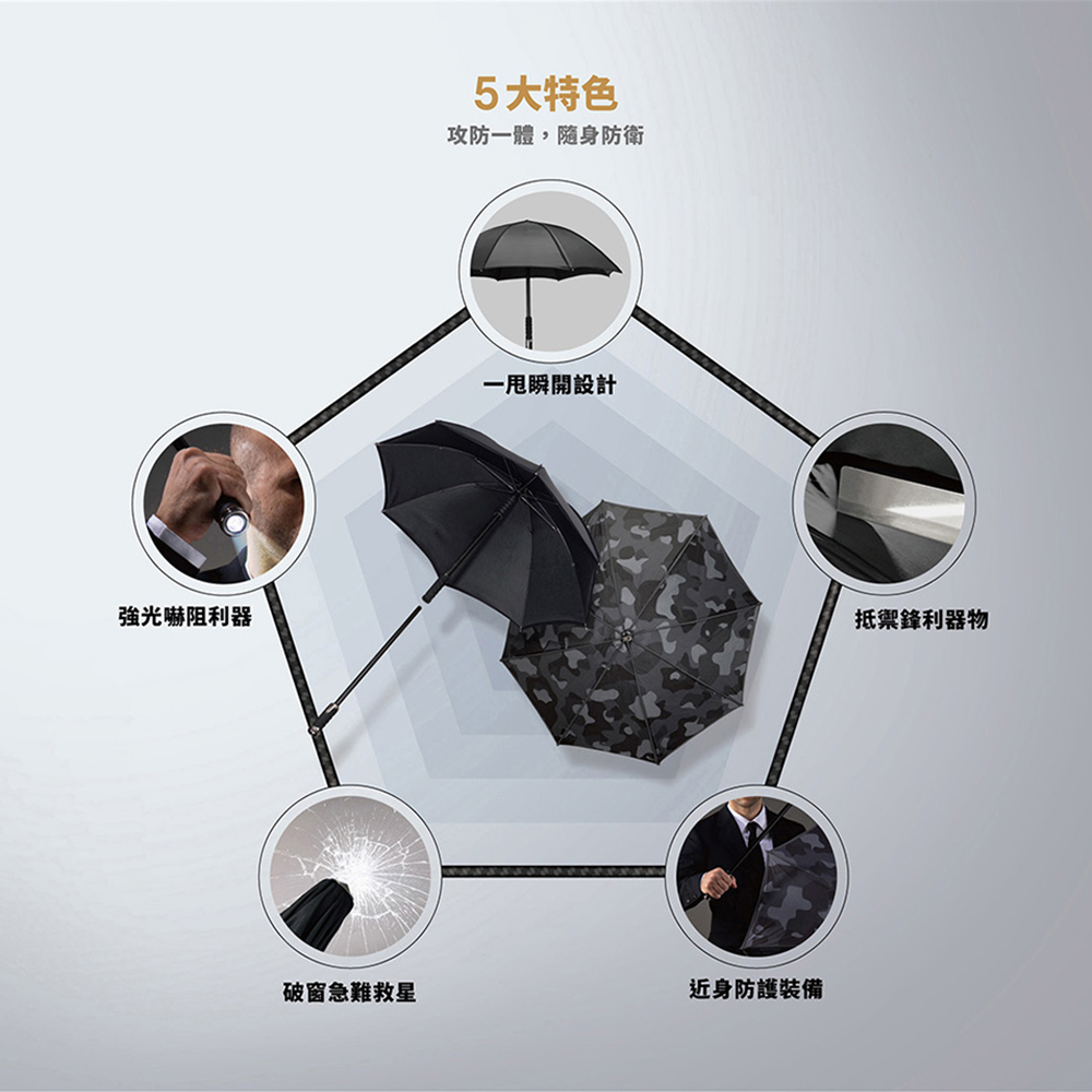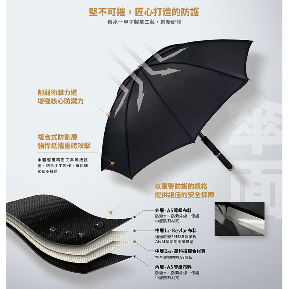 獨特「凱夫拉爾纖維」,抵抗穿刺防刀割 五層傘布構造,隨身防護安全加持 碳纖可抽式中空中棒,輕量強韌 鋁合金抽取式內中棒,抵抗襲擊加倍防禦