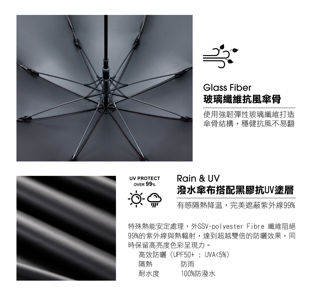 抗風玻纖傘骨搭配精緻好握磨砂手把