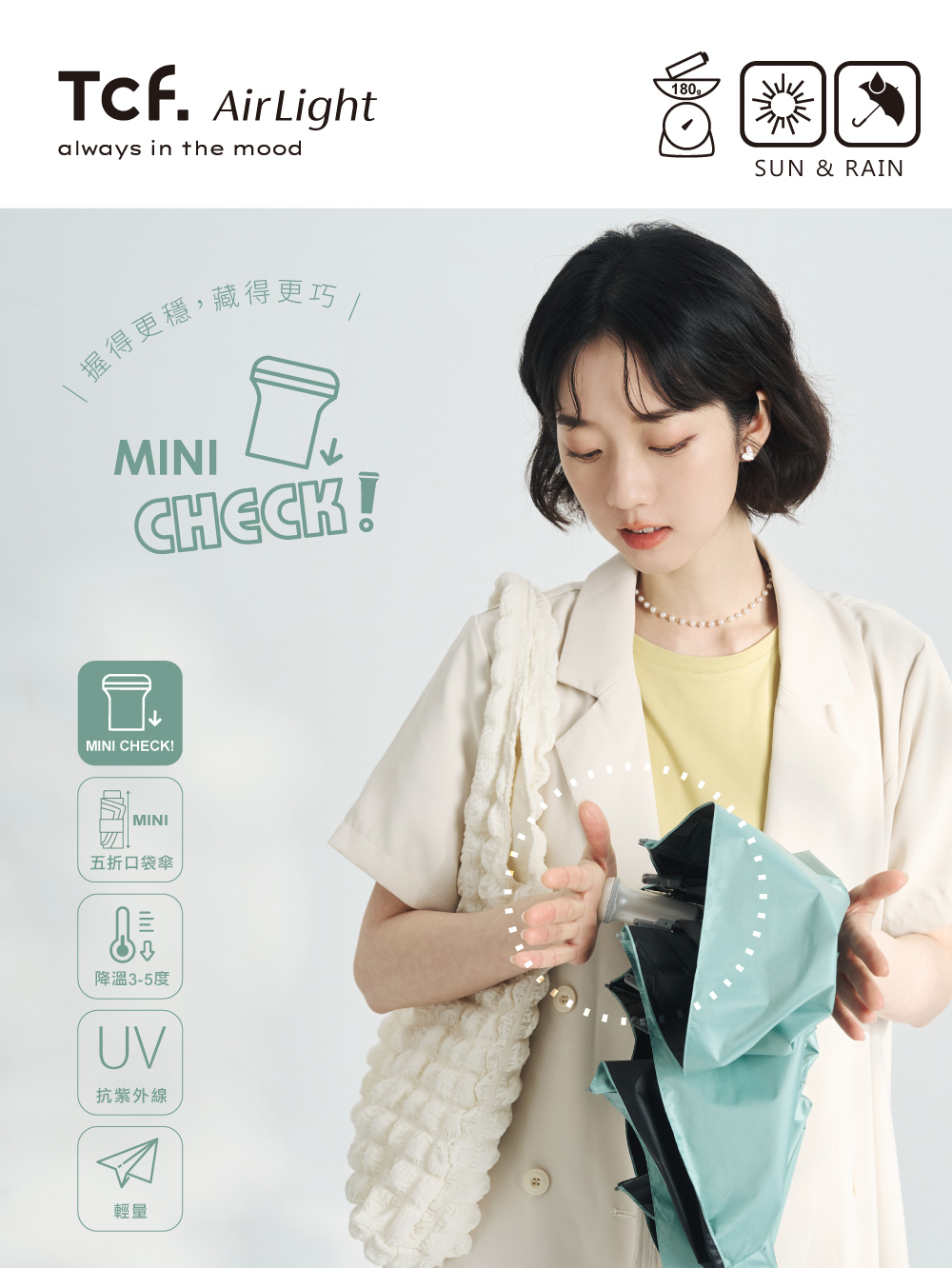 【品名】Airlight MINI CHECK 全遮光黑膠五折口袋傘(隱藏握把)