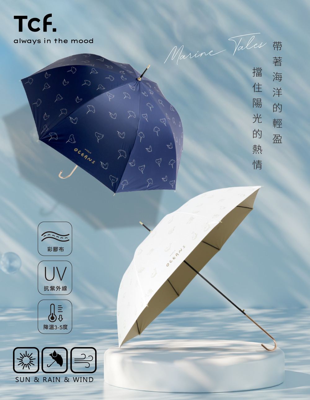 【品名】Tcf. 海洋故事 全遮光彩膠抗UV自動直傘(金柄)