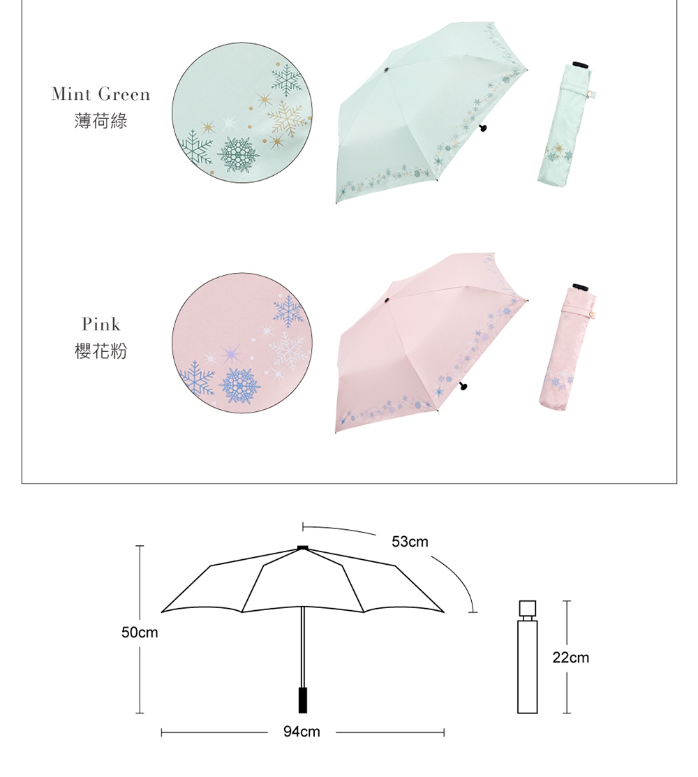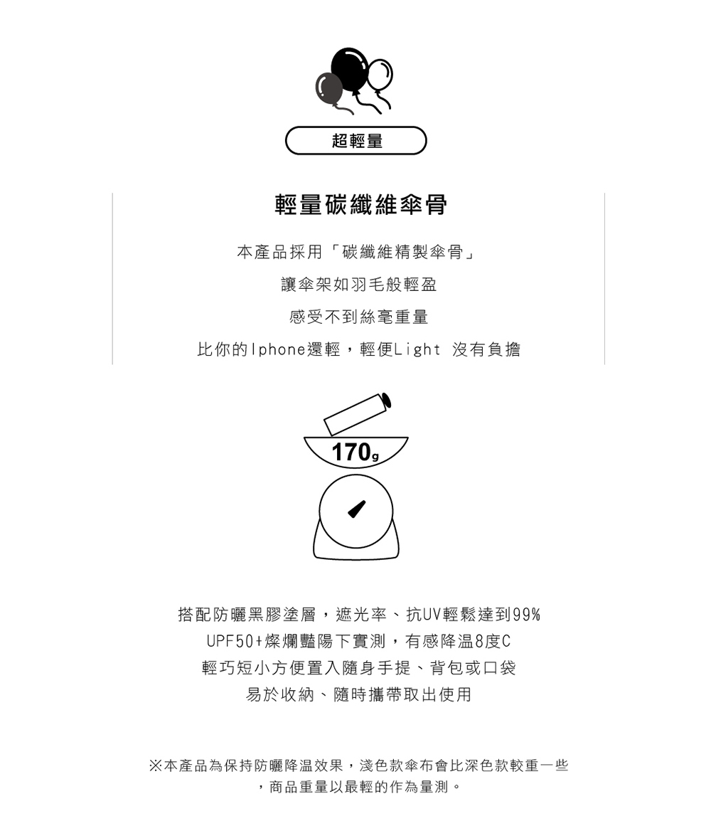 【重量】170g ± 10g (為保持防曬降溫效果,淺色款傘布會比深色款較重一些)
